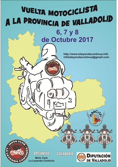 El Moto Club La Leyenda Continúa de Valladolid, organizador de entre otras actividades de la Concentración Invernal de Enero "La Leyenda Continúa" en Cantalejo (Segovia), organiza los días 6, 7 y 8 de octubre de 2017 la "Vuelta Mototurística a Valladolid", un fin de semana completo desde la noche del viernes en la que tendrá lugar la recepción a los motociclistas participantes en un hotel local, hasta el almuerzo de despedida del domingo.